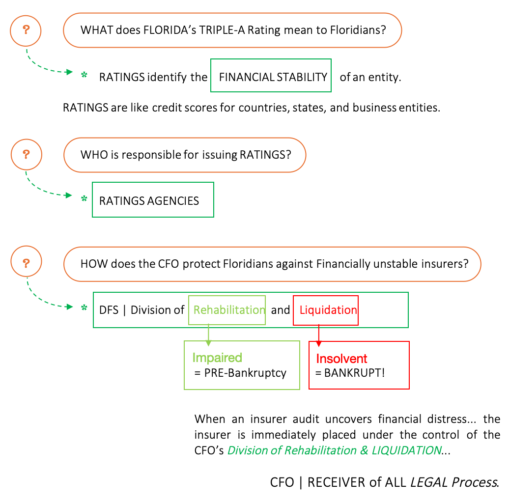 When it’s in Florida’s best interest, the CFO’s Department will provide impaired insurers with assistance to help them correct their deficiencies. When it makes financial sense, the CFO even has the authority to LEND Impaired Insurers money. Not too long ago, the CFO saved Florida’s Housing Insurance RATING by infusing TWO BILLION DOLLARS into residential reinsurers.