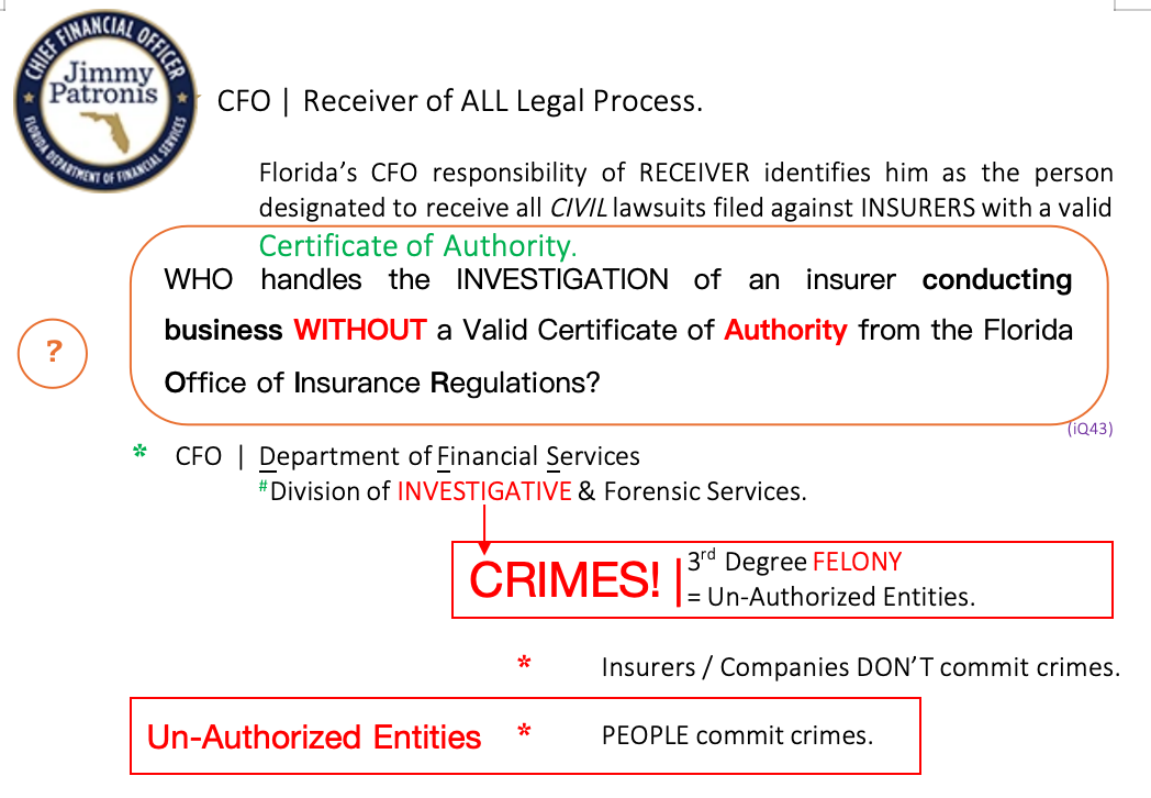 When answering iLaw questions on the state exam, it’s important to identify the adjectives / descriptors setting up your question. When a PERSON commits an insurance CRIME, the CFO sends a Sworn Law Enforcement Officer. DFS Investigators are armed. They conduct criminal investigations and have the Authority to detain suspects.